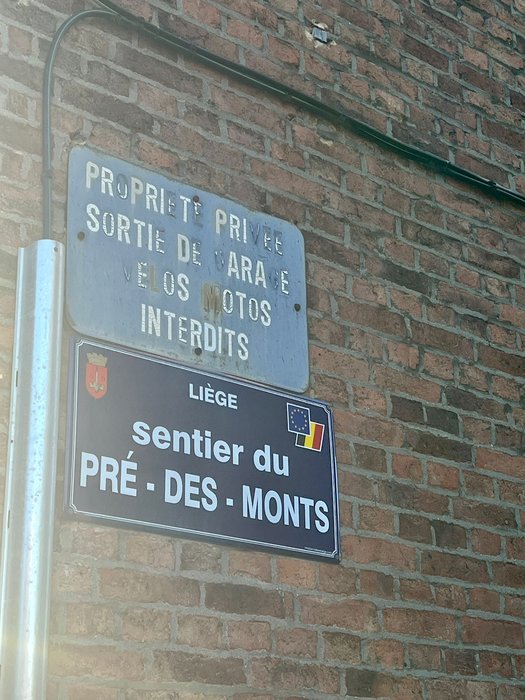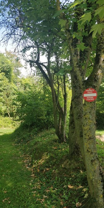 Juste au-dessus de la signalisation sentier installée par la ville de Liège, un panneau propriété privée dissuasif. Egalement à l'extrémité du chemin pointillé rouge/bleu (mais vieux et quasi illisible)