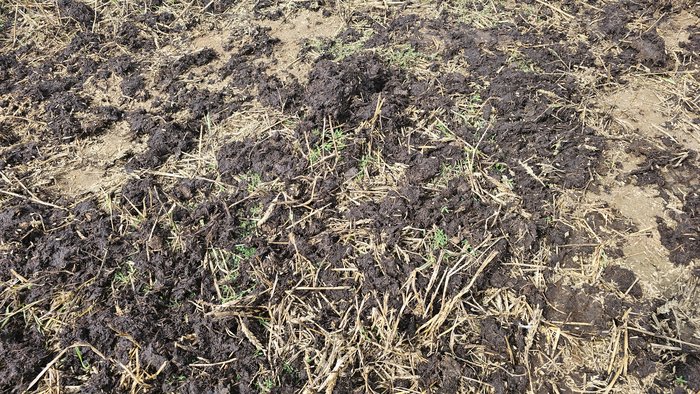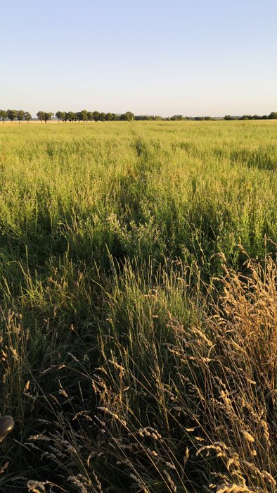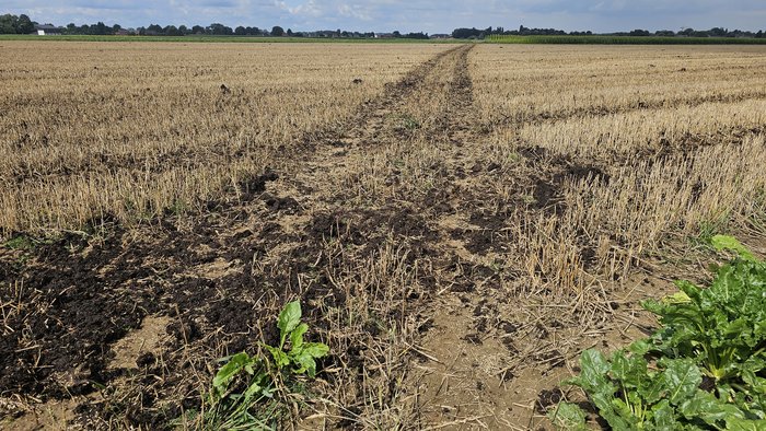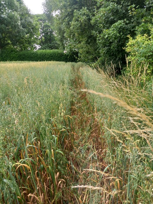 Tronçon travaillé par l'agriculteur comme si le sentier n'existait pas alors qu'il est clairement balisé et indiqué comme sentier public. Le sentier est inlassablement retracé par le passage des usagers après chaque opération agricole (labour, fraisage, semis, ...)