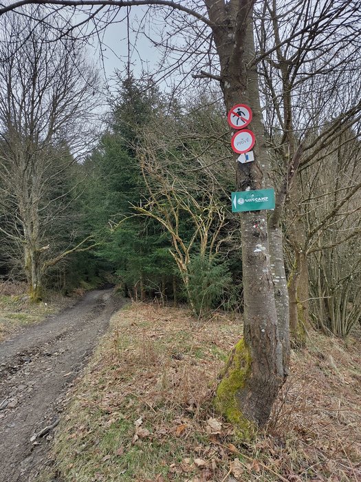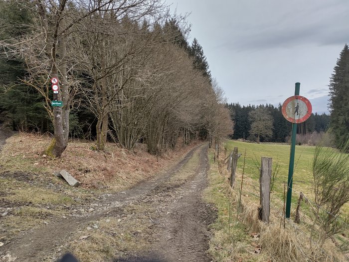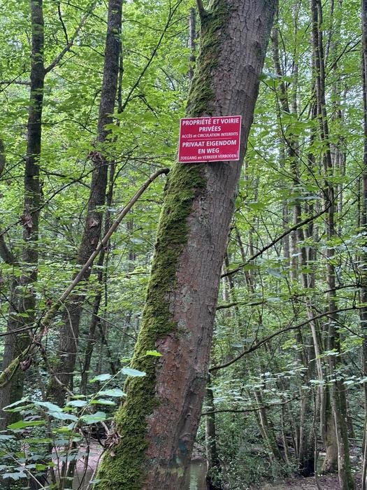 Présence d'un panneau "voirie privée, accès interdit" aux deux entrées de ce chemin forestier, normalement ouvert au public (https://chemins.be/culdessarts/chemin/20) + manque d'entretien sur une partie de celui-ci.