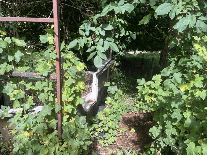 Sur le Chemin Vicinal N°05: Accès 2. En juin 2024, aux deux entrées du chemin, il y avait des clôtures. En septembre 2025, la clôture est peut-être encore présente mais est masquée par des déchets de tontes et des branchages placés pour dissuader de son utilisation ? Du coup, sur le chemin la végétation a repris le dessus.