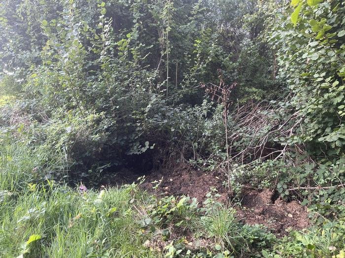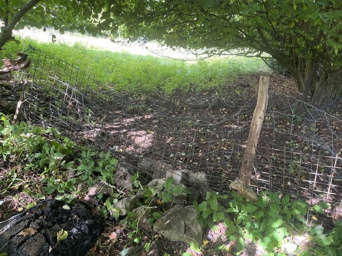 Le petit chemin en contrebas des Roches-Noires, longeant le champ, est entravé de coupes de branches sur lesquelles ont poussé la végétation. Le passage n'est plus possible.