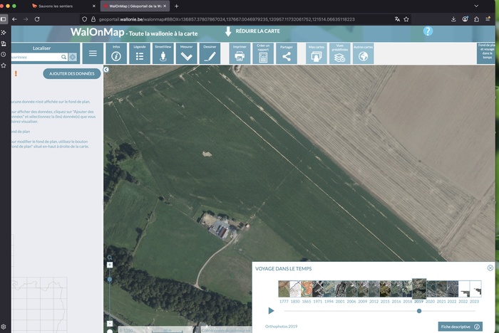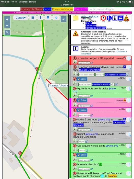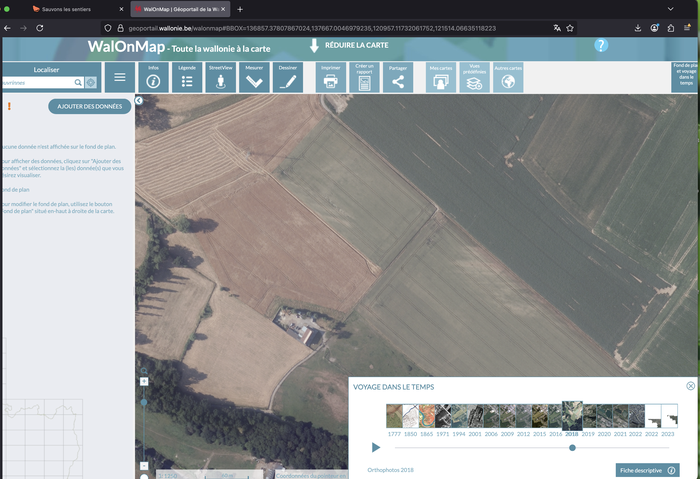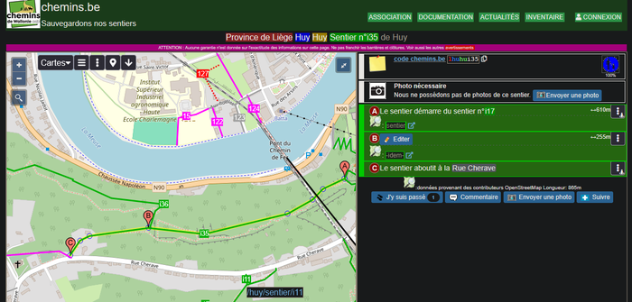 L’association « de défense de la petite voirie » Chemins de Wallonie s'affaire depuis des années à répertorier et actualiser nos sentiers publics. Ils estiment leur couverture du territoire wallon à 87%. Eux aussi fonctionnent de manière collaborative et ouverte, avec l’aide de bénévoles et en recoupant les différentes sources cartographiques existantes : Atlas, IGN ou encore OpenStreetMap.
