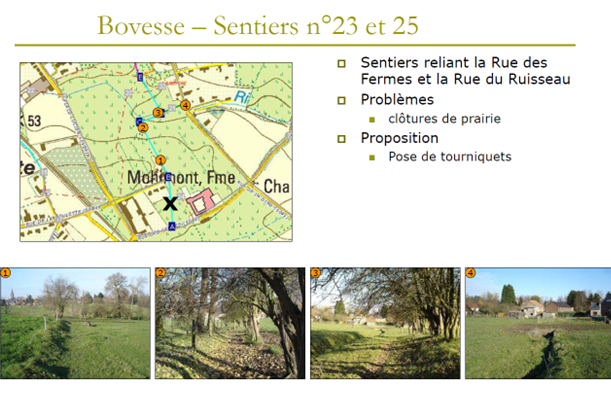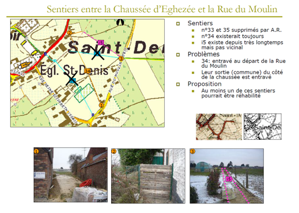 Le sentier répertorié numéro 97 à l'atlas vicinal permet de rejoindre le centre du village, les infrastructures sportives et les locaux des scouts. Il assure aussi le maillage avec d'autres sentiers, eux aussi fermés par un particulier. Pourtant ces sentiers relient 4 quartiers et sont une alternatives aux trottoirs quasi inexistants. En 2021, une enquête publique a été lancée. Il s'agissait d'un projet globale pour plusieurs sentiers fermés sur un même site. Plus de 400 participants se sont manifestés favorablement, contre une soixantaine qui s'y sont opposés (essentiellement des agriculteurs) Les membres du collège ont refusé la demande.