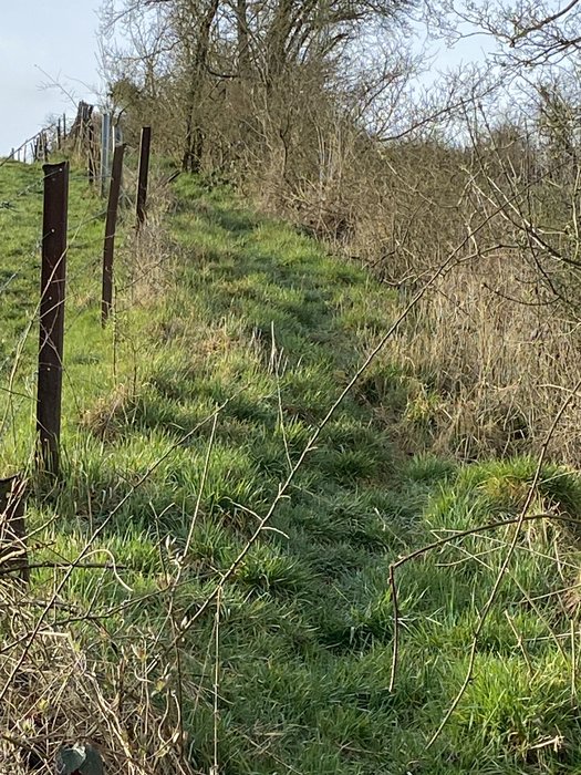 Le chemin n'est pas nettoyé et, arrivé à la prairie, les barbelés entravent le chemin qui remonte dans le champs jusqu'au chemin d'Inzemont.