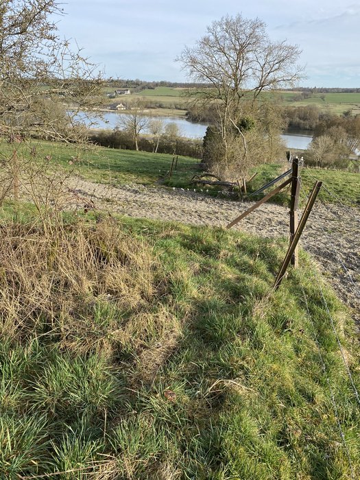 Une barrière entrave le sentier qui est d’ailleurs un parcours vtt. Le fermier a fait se rejoindre 2 pâtures séparées par le sentier. Impossible donc de l’utiliser.