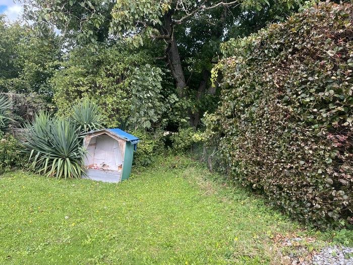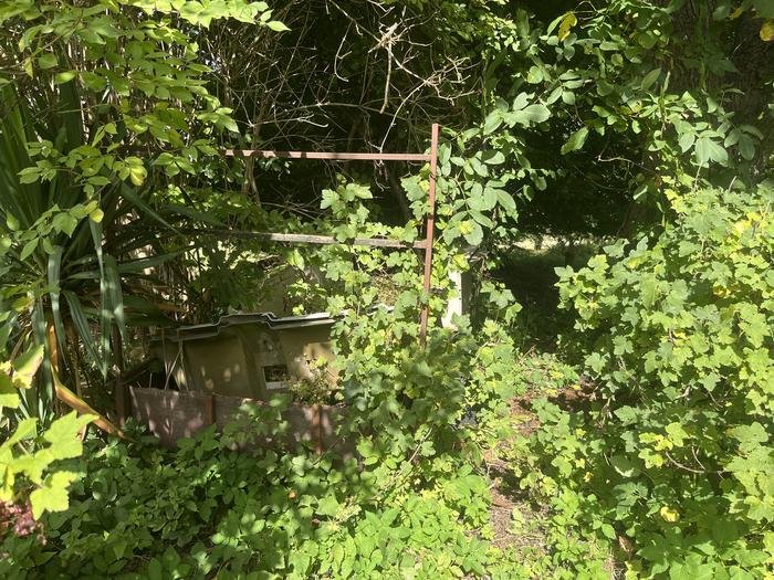 Sur le Chemin Vicinal N°45: A l’un des accès au chemin, d’abord des arbustes, ensuite des déchets de tonte, une remorque, ensuite des cailloux et une clôture.