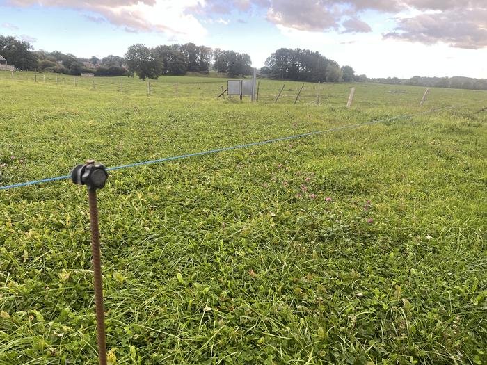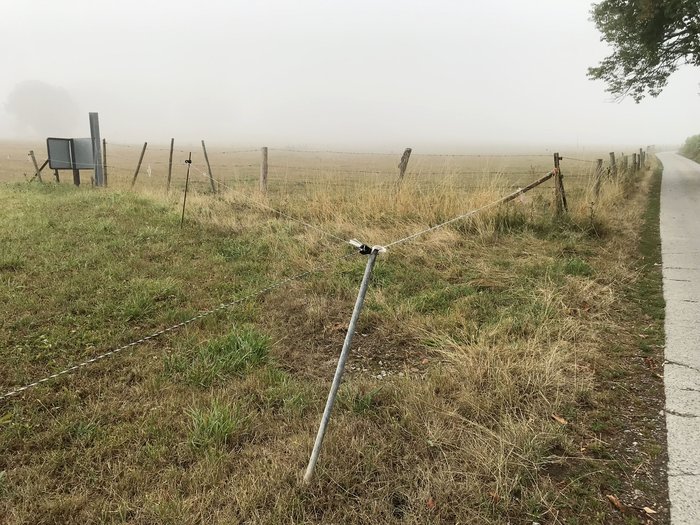 Sur le Chemin Vicinal N°20: A l'entrée de celui-ci, du côté du chemin de remembrement, vers le premier tourniquet, souvent mais pas toujours, une clôture mobile électrique de prairie dissuade d'emprunter le chemin situé dans la pâture. Photos: 25/04/2024 et 15/09/2025.