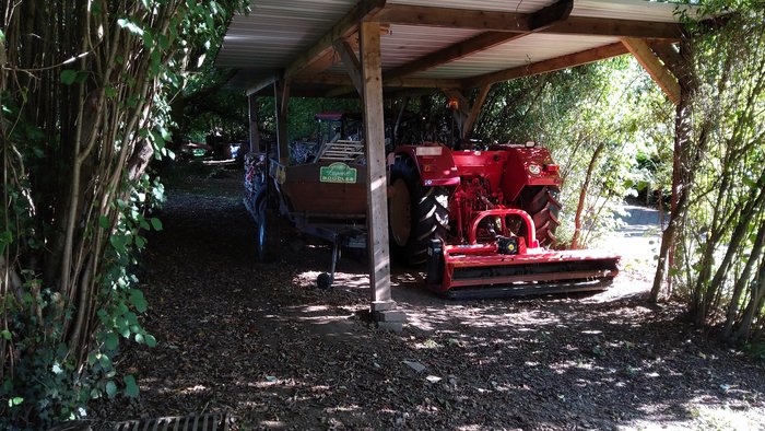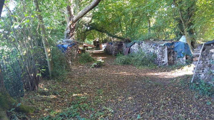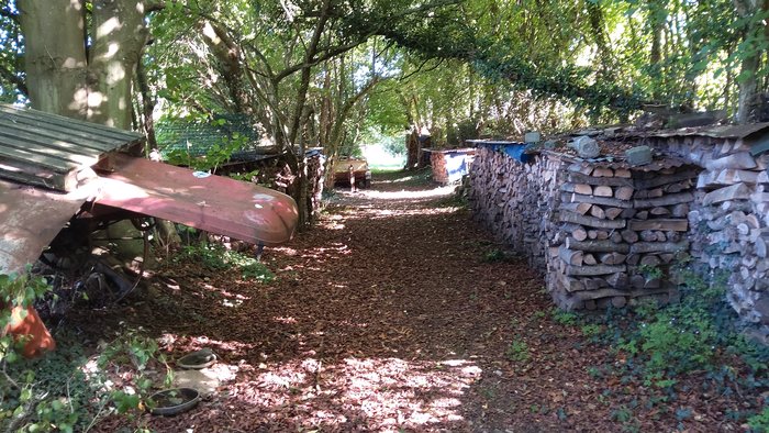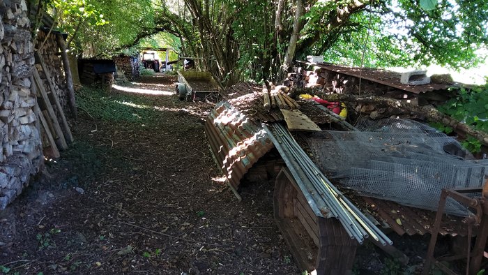 Sur le Chemin Vicinal N°39: Accès 1. Même si l’accès au chemin est peu visible mais possible, un abri pour un tracteur et une remorque a été construit en partie sur celui-ci. Ensuite, même si cela n’entrave pas la progression des marcheurs ou cyclistes, puisqu’à cet endroit le chemin est bien large, des bûches, une remorque, des matériaux de construction,… posés de part et d’autre du chemin.