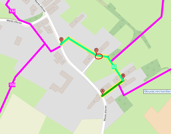A droite du numéro 28 du marais d'Acren se situe un chemin (code chemin : hlsda52), les habitants du numéro 22 ont installé un portail obligeant les gens qui empruntent le chemin d'entrer sur leur propriété en plus d'avoir bloqué le chemin avec une clôture.