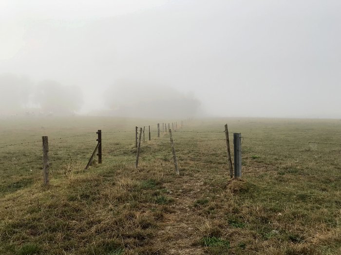 Sur le Chemin Vicinal N°11: En venant du haut, le chemin arrive à une clôture d’entrée de prairie. Un trace reste présente dans la pâture mais a tendance à disparaître. A l’extrémité du champs, après la clôture fixe, il se dissipe dans la végétation.