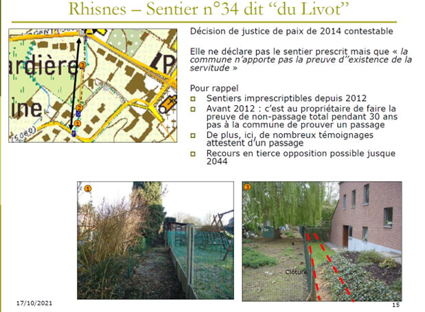 Décision de justice de Paix d'Eghezée en 2014 permettant aux riverains de récupérer le sentier (public) du Livot (N°34 Rhisnes). Tout à fait contestable mais la commune n'a pas été en appel.