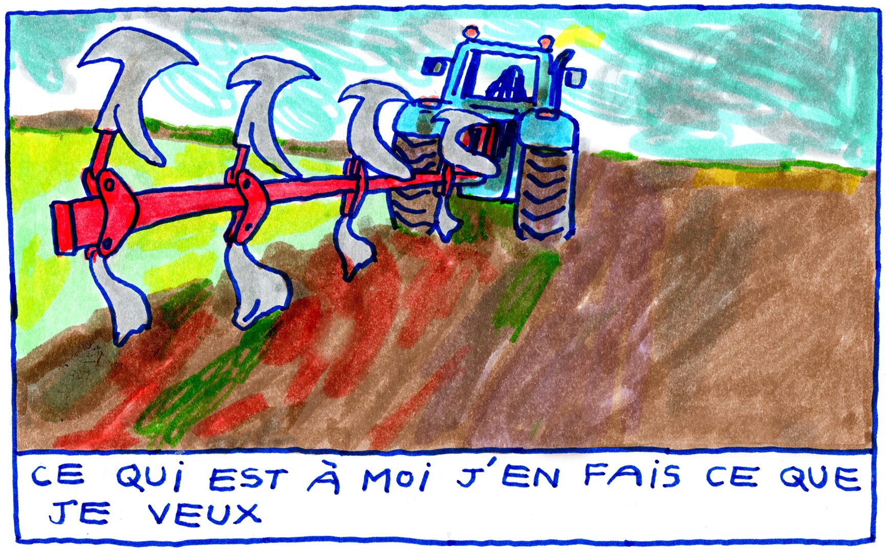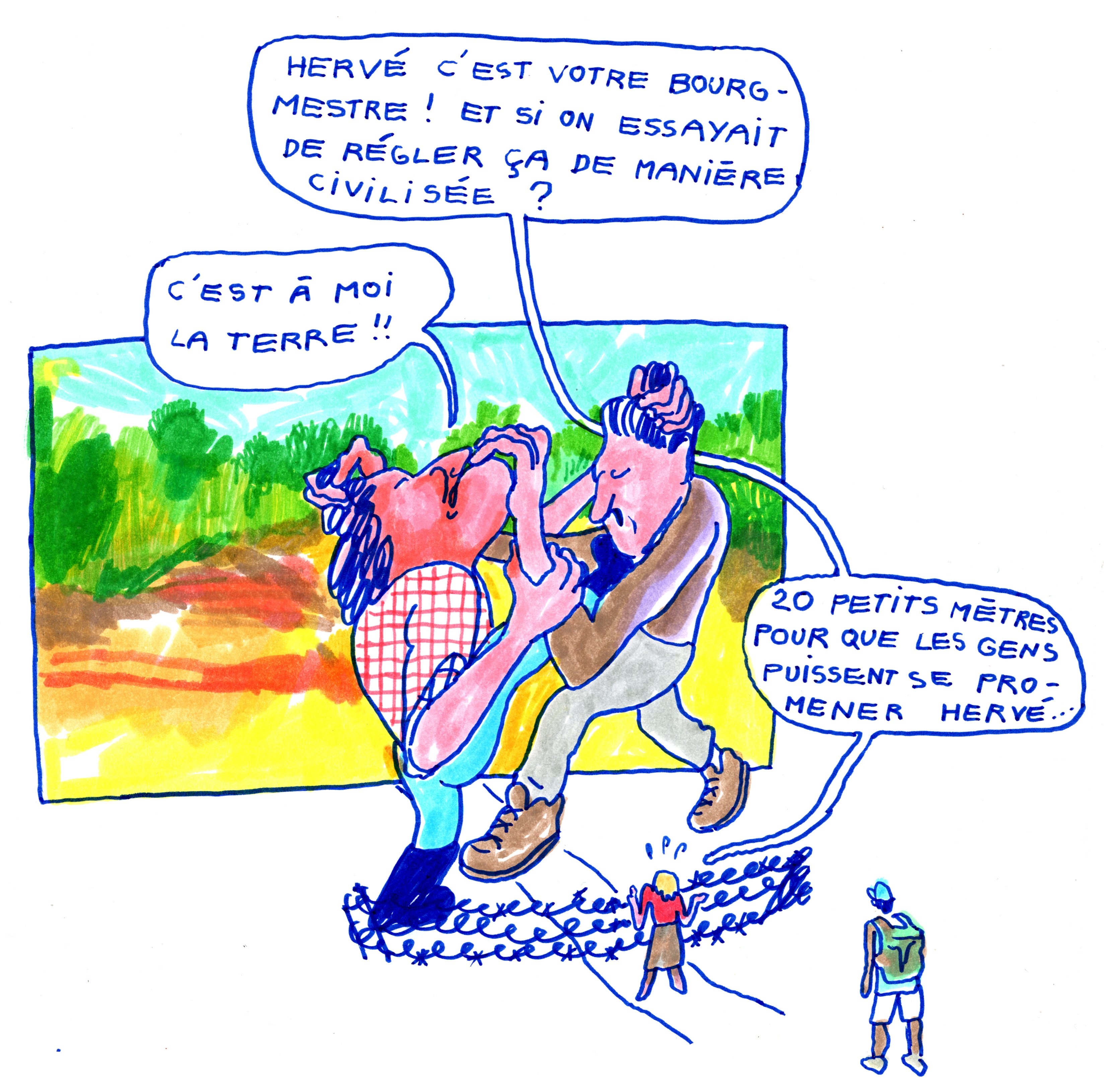 Sur le terrain, un propriétaire dégage un bloc de béton à la masse et refait le terrain. Une personne (Hervé* ?) replace la clôture et une remorque pour bloquer le passage. Suivent des explications d’habitants mêlant jalousie, messes basses, paroles rapportées, histoires de famille, de terrains, d’intérêts cachés, d’intimidation, voire de menaces. Deux anecdotes nous sont racontées par des sources différentes et en fonction des intérêts, les versions s’adaptent. Des détails gonflent, d’autres sont tus.